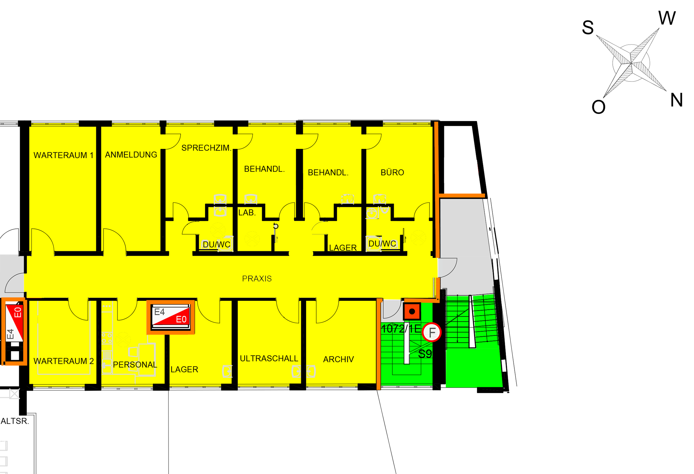 Im Westtrakt, 2. Obergeschoss (aktuell als Ebene 4 ausgeschrieben) werden Ordinationsräume ab 01.01.2026 verfügbar. Neben Behandlungsräumen ist auch eine Anmeldung und ein Warteraum sowie ein Personalraum und eine Umkleide eingrichtet. Die Gesamtfläche beträgt 250 m².